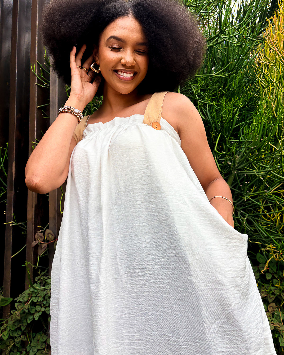 Made from a linen-feel fabric that breathes beautifully, Himari wraps you in softness while keeping things cool and flowy. Adjustable straps, side pockets with contrast trim, and an airy silhouette make it the ultimate comfort piece — perfect for slow days, beach walks, or golden afternoons in the city.