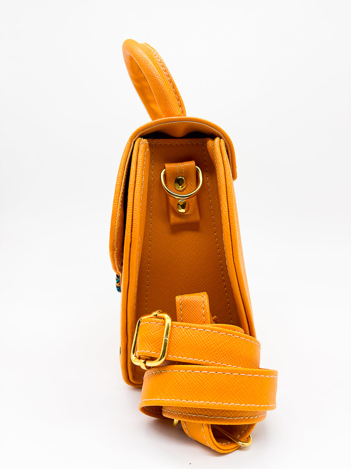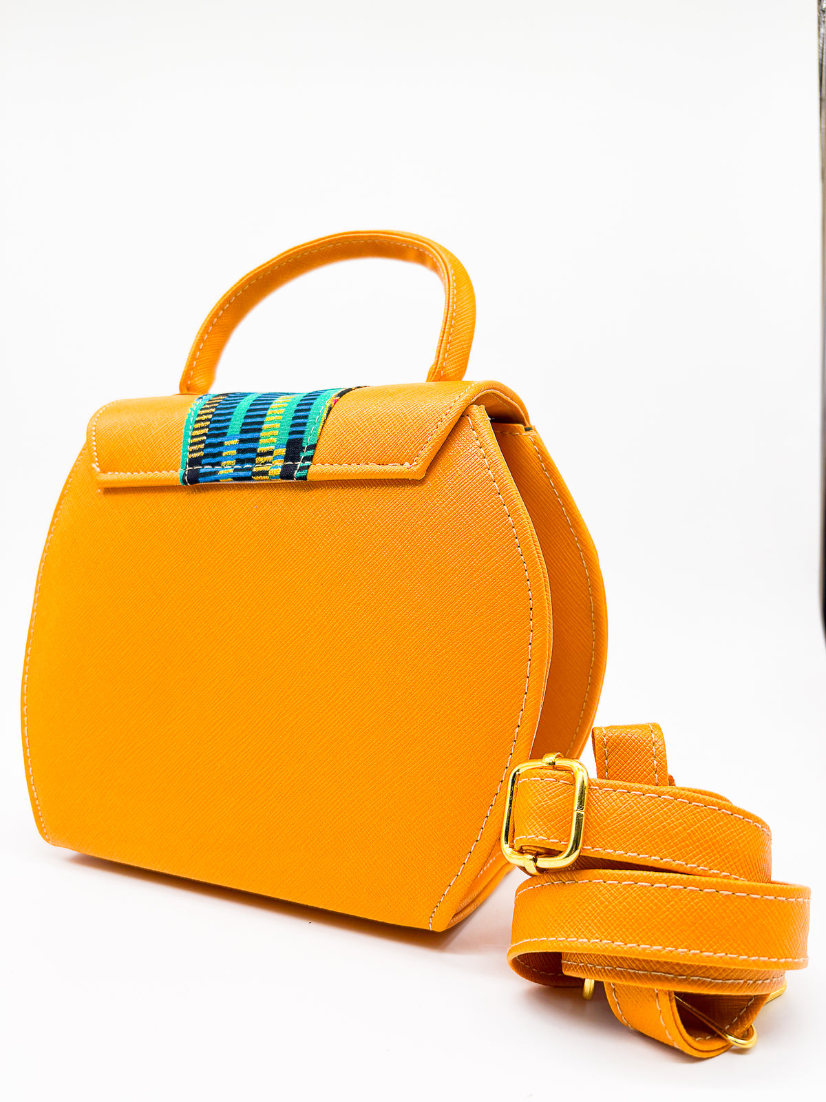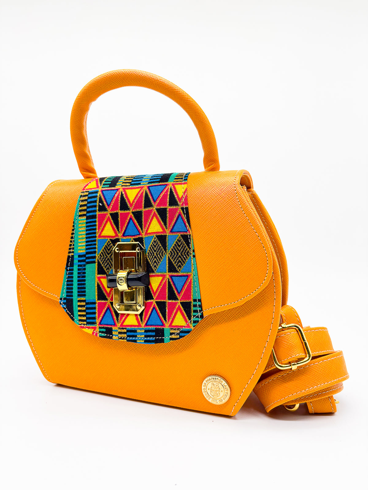 The Kathleen handbag is designed with a timeless elegance, perfect for adding a sophisticated touch to any look. Crafted with African Gold Wax fabric and vegan leather, it features a twist-lock, adjustable strap, and round shape for maximum style and convenience. Named after a friend of Dr. Pachanga, this bag is sure to make any outfit pop with flair and pizzazz.